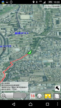 電子コンパスによる進行方向の矢印が出るのは,2次元の地図と同じです. また,ヘディングアップボタン