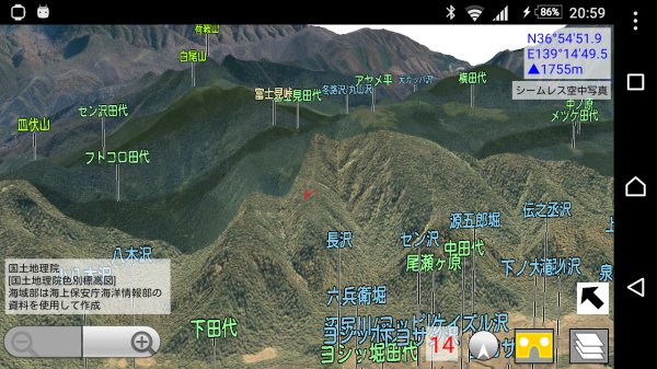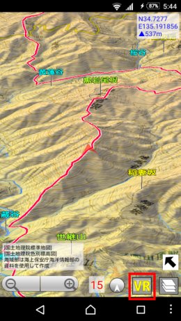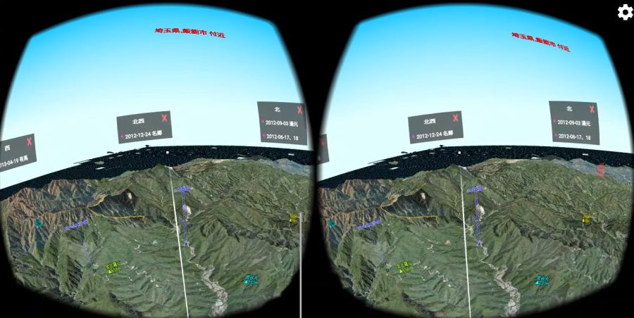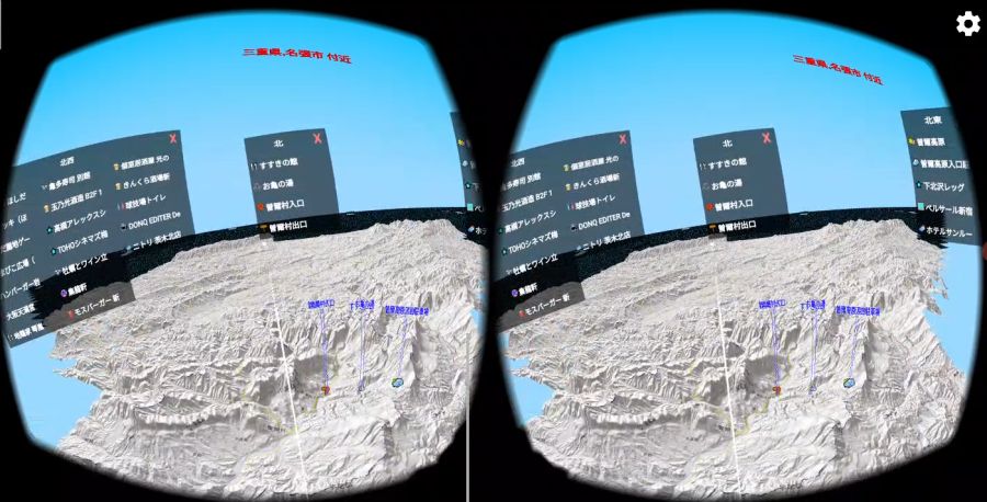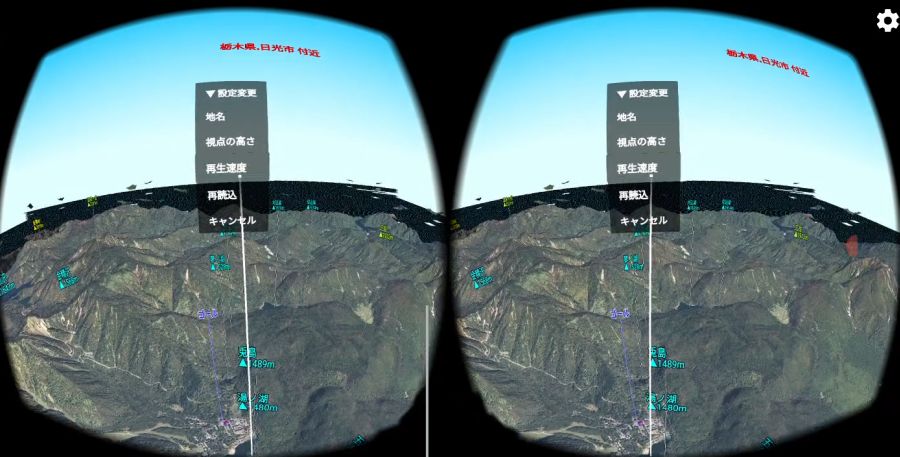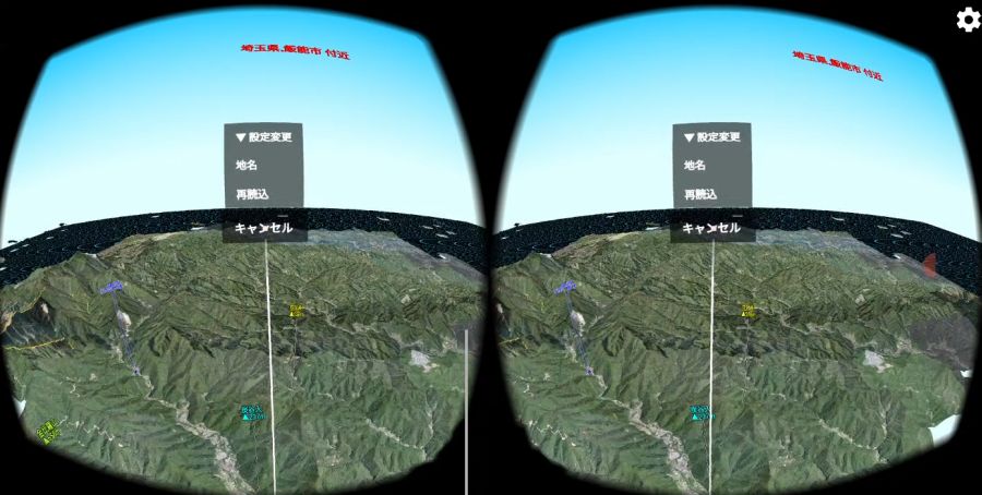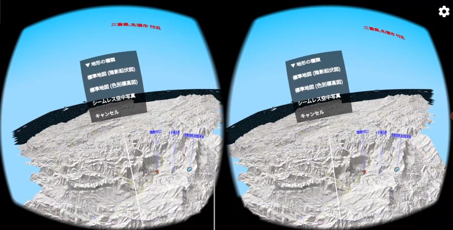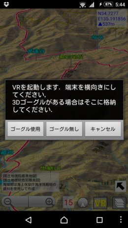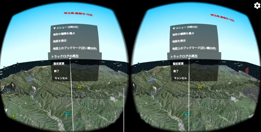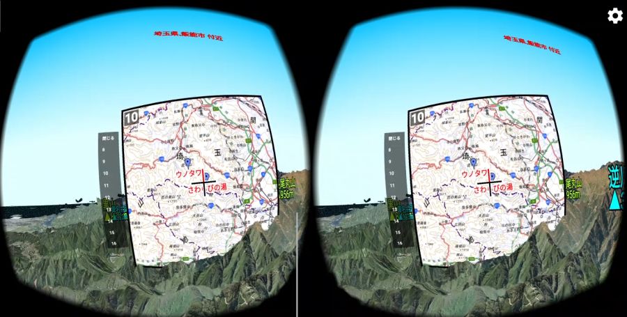 を押すと,進行方向が上になるように地図が回転します. VR(仮想現実)機能地図ロイドのバージョン14.4からは,3Dゴーグル(Google Cardboard等)を使ったVR(仮想現実)に対応しました.3D地形の仮想空間を,自由に飛行できます. ※Android 4.4以上の機種のみ対応.ただしZenfone端末などジャイロセンサー非搭載の機種は使用できません. ※Daydream VRヘッドセット(Mirage Solo等)専用に,新アプリ「地図ロイドReality」をリリースしました.(2018.10.05)