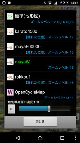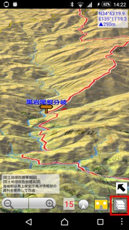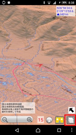 カスタム地図の利用地図ロイドではカスタム地図機能として, カシミール3Dのマップカッターで切り出した地図を取り込んで,それを表示することができますが, これを3Dでも使用できます.(バージョン14.7から) カスタム地図の取り込み方法については,カシミール3Dで作成した地図を使う(カスタム地図) を見てください. 3D画面で右下のレイヤーボタンを押すと,取り込まれているカスタム地図のマップ名も出ますので, それを押せば切り替わります.