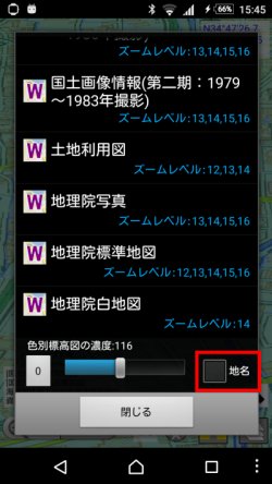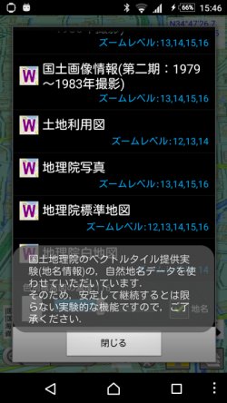 を押すと,設定されているWebマップタイルの名前が出ますので,そこから選べば表示できます. タイルの設定方法は, Webマップタイル機能の説明を見てください. [使用例 (シームレス空中写真)]