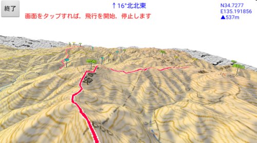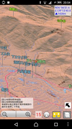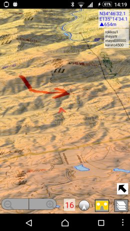 【離れた位置】と出ているマップを選ぶと,そのマップ範囲の中心位置まで移動します. なお3D地図の画面には,ここで選んだマップ以外でも表示範囲に入っているマップが自動的に表示されます.(右上に出ているのが,現在3D処理中の全マップ名です) もし表示するマップを絞りたい場合は,カスタム地図のマップ名に拡張子をつけてグループ化すれば, 選んだマップと同じグループの地図だけ表示されるようになります. 詳しくは,カスタム地図説明ページの 「(B) 複数のマップを使いこなす」 「3. マップのグループ化で自動切り替えを使いこなす」を見てください. ※QuaTab01で,設定によっては3Dのカスタム地図の表示が欠けるという現象があります. その場合,MENU-設定-詳細設定の「地図タイルを減色して表示」がオンになっていることを確認してください. 初期状態ではオンですが,これをオフにすると,機種によってはそうなるようです. 山旅ロガーGOLD併用による現在地の追尾地図ロイドのバージョン14.8からは,山旅ロガーGOLD併用による現在地の追尾に対応しました.山旅ロガーGOLDでの測定中に山旅ロガーGOLDから地図ロイドを起動すると, 地図ロイド上で現在地の追尾が行われますが,この状態で3D機能を起動すると, 3D表示上での現在地追尾を行います. [使用例]