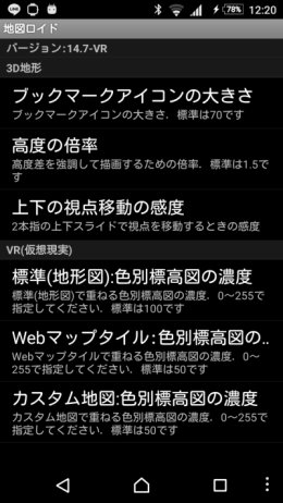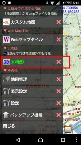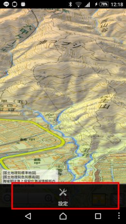 実験提供されているものですので,安定して継続するとは限らない実験的な機能ですので,ご了承ください. 次回以降は,ダウンロードせずにそこの内容を使いますので,電波圏外でも表示できます. 設定の変更3D地形の表示中に,メニューボタン-設定 で,表示に関する設定を変更できます.