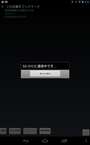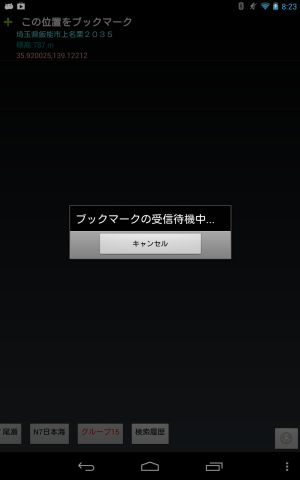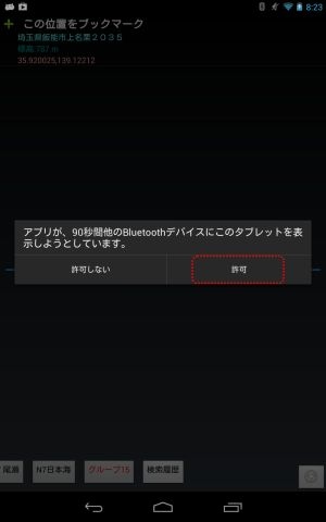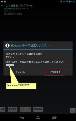 ここで,今回の送信先(Nexus7)を押して下さい. 検索するのには,しばらく時間がかかる場合がありますが,もし1分程度たっても表示されない場合は,コピー先の端末が「受信待機中...」になっているかどうかを確認して下さい. もしそれでも駄目な場合は,両方の地図ロイドを終了して,端末の設定でBluetoothを一旦オフにしてからやり直して見て下さい. 送信先(Nexus7)を押すと,両方の端末にペア設定リクエストの確認画面が出ます.