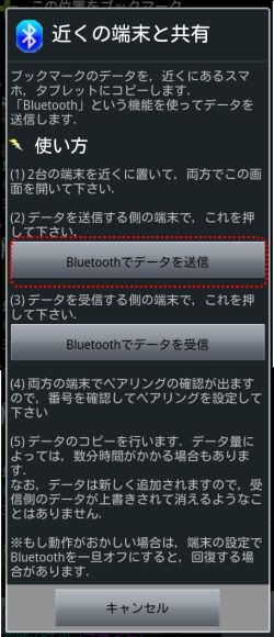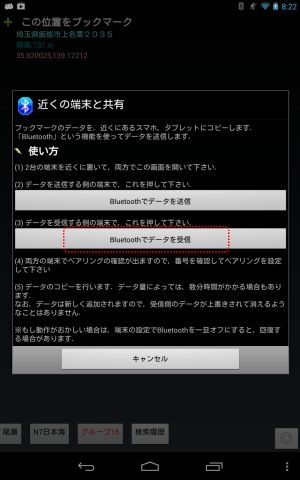 ブックマークの場合と同じように, ・送信する側(Xperia)では「Bluetoothでデータを送信」 ・受信する側(Nexus7)では「Bluetoothでデータを受信」 のボタンを押して進めて下さい. 送信するデータは,現在表示しているグループ全体(一番上)を送信するか,グループ内の1データだけを送信するかを選ぶことができます.