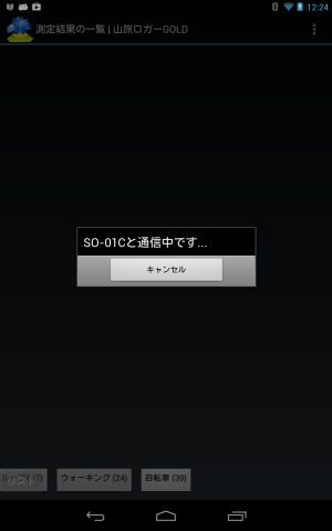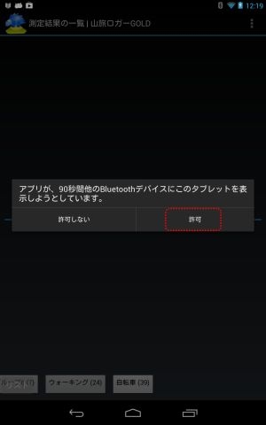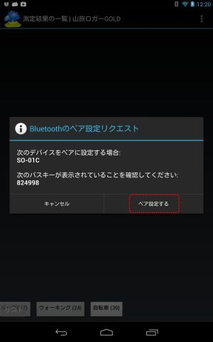 ここで,今回の送信先(Nexus7)を押して下さい. 検索するのには,しばらく時間がかかる場合がありますが,もし1分程度たっても表示されない場合は,コピー先の端末が「受信待機中...」になっているかどうかを確認して下さい. もしそれでも駄目な場合は,両方の山旅ロガーGOLDを終了して,端末の設定でBluetoothを一旦オフにしてからやり直して見て下さい. 送信先(Nexus7)を押すと,両方の端末にペア設定リクエストの確認画面が出ます.