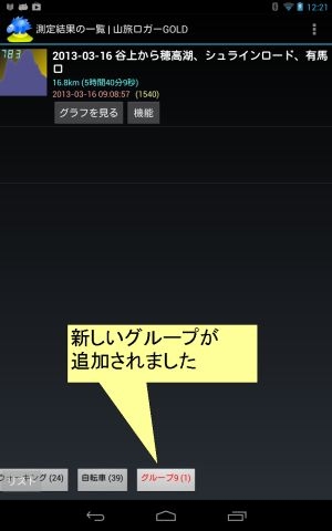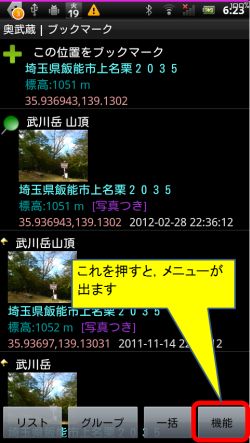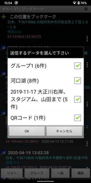 OKを押したあとは,今までのグループごとの送信の場合と同じです. (C) 地図ロイドのトラックログをコピーするトラックログのデータをコピーする場合は,メニュー(:)-トラックログ でトラックログ一覧画面を開いて下さい.そして,ブックマークの場合と同じように右下の「機能」ボタンを押して,