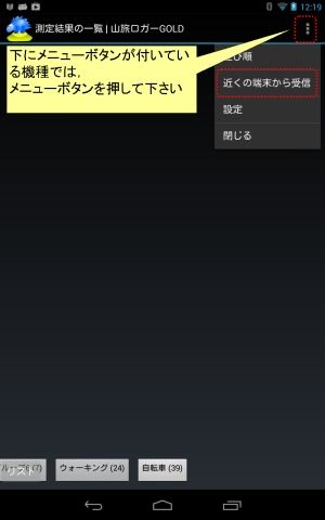 ここで一旦Xperiaを離れます.Nexus7を操作します. 2. 送信先の端末での操作Nexus7では,測定結果の一覧画面で「:」-「近くの端末から受信」を選んで下さい.