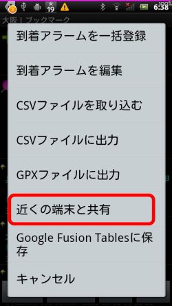 既存のデータはそのままで,影響を受けません. (B) 地図ロイドのブックマークをコピーするコピーする2台を,近くにおいて下さい.1. 送信元の端末での操作そしてスマホ(以下,Xperia)で,メニュー-ブックマーク としてブックマーク一覧画面を開きます.
