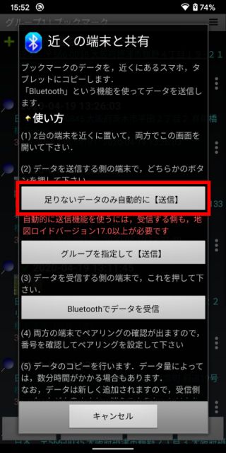 (B-2) 地図ロイドのブックマークをコピーする(新機能.足りないポイントのみ)地図ロイドのバージョン17.0からは, ブックマークの近くの端末へのBluetoothコピー機能で,足りないまたは更新されたポイントを自動検索してコピーできる機能が追加されました. 2台以上で簡単にブクマデータを揃えることができます受信側は,今までと同じ操作で「Bluetoothでデータを受信」を押してください. 送信側は,新しく追加されたボタンを押して進めます.画面を貼ります.