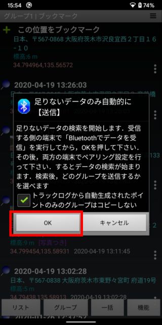 (D) 地図ロイドと山旅ロガーの間でトラックログをコピーするトラックログのデータは,地図ロイドと山旅ロガーGOLDの間でコピーすることもできます. 片方で送信,片方で受信してください.コピーする方向は,どちらでも可能です.うまくいかないときコピー先として端末が出てこないコピー先の端末を「受信待機中...」にしていても,一覧に出てこない場合は, 地図ロイドまたは山旅ロガーをいったん終了して,コピー元,先の端末同士でペアリングの設定をして下さい.機種によりますが,「設定」アプリ