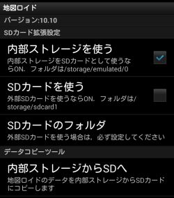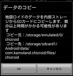 このフォルダは機種によって違いますが,通常はデフォルトで正しい内容が表示されますので, そのままOKボタンを押せば行けるはずです. 駄目な場合は,AndExplorerなどのファイルマネージャアプリを使うなどして,フォルダ名を確認してください. ※auの機種ですと,このページが参考になりそうです.→「外部メモリ | Android(TM) 技術情報 | au」 「SDカードを使う」を有効にできたら,今までに保存した地図ロードのキャッシュなどのデータをSDカードにコピーしたいところです. 手動でコピーしても構いませんが,コピーツールを用意しています. 下のデータコピーツールの「内部ストレージからSDへ」をタップすれば,コピー処理を行います.