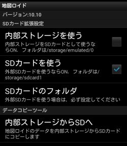 デフォルトでは内部ストレージになっています. 「SDカードを使う」を押すと,SDカードを使うようになります. 地図ロイドを再起動すれば,反映されます.