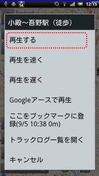 トラックログ名が出ている部分をタップするとメニューが出て,「再生する」で再生を開始します.