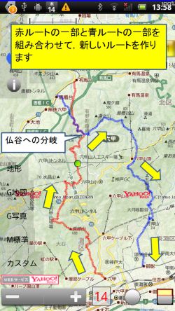 自分が今までに記録したり,ヤマレコなどで取得したGPXファイルのルートが, そのままは使えないが一部は使えるという場合に, 部分部分を組み合わせて自分の必要なルートを作ることができます. ※GPXファイルのルートがそのまま使えるのでしたら,そのまま使ってください. → GPXファイルを読み込む バージョン10.9からは,流用元のルートの時刻をもとに,所要時間が自動的に設定されるようになりました. ただしポイントを直接指定して直線や道路沿いで作成した場合の所要時間は,換算用の移動速度から計算されます (デフォルトは4.8km/時.メニュー-設定-距離測定/ルート作成 にあります). (標高データの設定も可能です.→ 地図ロイドでルートを作成) A.基本編下の地図に出ている赤と青のルートは,どちらも南の阪急電車の駅から出発して, 北の神戸電鉄の駅まで歩いています.このルートを組み合わせて,南から赤のルートで出発して,青のルートで南に下山するというルートを作ってみます. 仏谷への分岐で,赤ルートから青ルートに移ります.