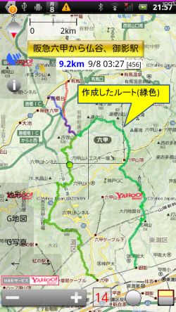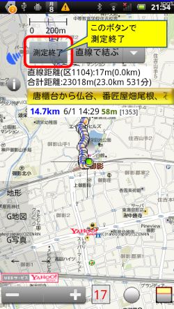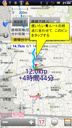 この直線部分のコースタイムは,設定された換算用の移動速度から計算されます. (デフォルトは4.8km/時です.メニュー-設定-距離測定/ルート作成 にあります) 青ルートへ結んだら,次は使いたい青ルートの範囲の終点に合わせてタップします. 今回は御影駅でタップします.