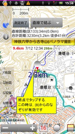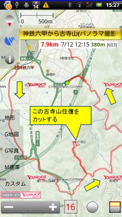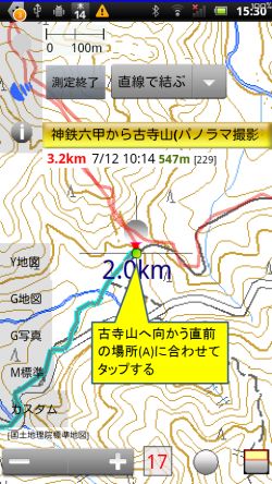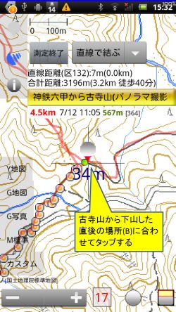 そして,古寺山から下山した直後の場所(B)に合わせてタップしてください.