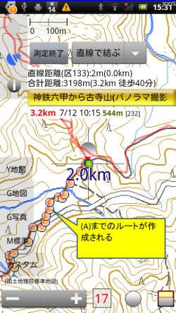 すると,赤ルートをなぞる形で神鉄六甲駅から(A)までのルートが作成されます.これは既に説明したとおりです.