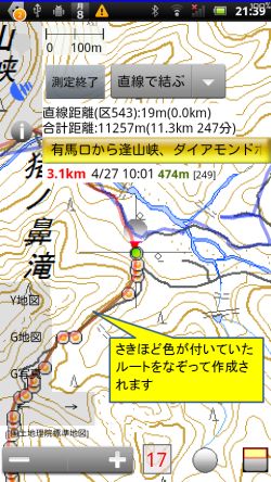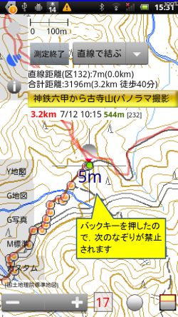 次がポイントなのですが,ここでバックキーを押してください. すると,次にタップした場所が赤ルート上にあっても,なぞりが禁止されるようになります.