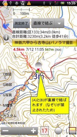 先ほどバックキーを押したので,先ほどと同じルート上の場所をタップしたにもかかわらず, なぞりが行われません. (A)~(B)を結ぶのには,上の選択(直線で結ぶ または 道路に沿う)が使われます.