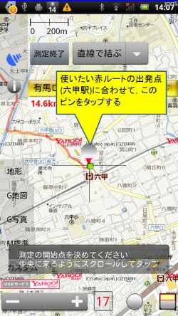 出発点に画面中心のピンマークを合わせて,ピンマークをタップします. 赤ルートを使うので,赤ルート上の点でタップしてください.