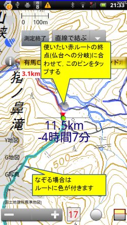 次に終点ですが,使いたい赤ルートの範囲の終点に合わせてタップします. (今回は,仏谷への分岐) 使われるルート範囲の色が水色に変わり,ルート沿いの距離と時間のガイドが出ますので,それで確認してからタップしてください.