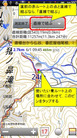 次に青ルートに移りますので,すぐ近くにある青ルート上の点に合わせてピンをタップしてください. ↑↑ ここが重要です ↑↑ 別ルートに移るのでなぞりは行われず,上の選択(直線で結ぶ または 道路に沿う)が使われます. 今回はすぐ近くなので直線で結びますが,離れていて途中に道路がある場合などは道路に沿うを使ってください.