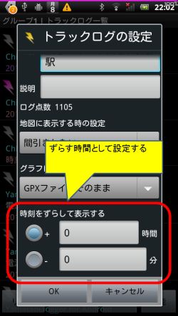作成したルートに設定される時刻作成したルートに設定される時刻ですが,作成した日の0時0分がスタート時刻になります.この時刻を実際の行動予定に合わせて変更したい場合は,トラックログ一覧画面から長押し-詳細設定で変更できます. もし日付を変更したい場合は,時間に大きい値(24以上)を入力してください.