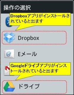 ここで,アップロードに使うアプリを選んでください. 今回は,Dropboxを選んでみます.Googleドライブを選んだ場合もほぼ同じです.