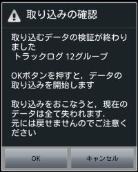 ここでOKボタンを押すと,山旅ロガーのデータが,ダウンロードした内容に丸ごと入れ替わりますので注意してください. 既存のデータは全て失われて,全体入れ替えになります. |