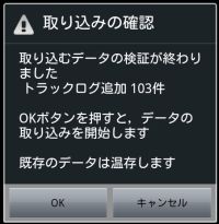 すると,山旅ロガーがデータの読み込みを始めます.内容の確認処理が終わると,確認画面が表示されます.