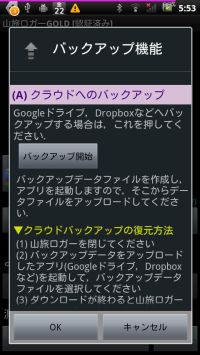 Google Drive,Dropboxへのクラウドバックアップ機能の説明.データを復元したり他の端末に移すのを楽にするためのものです.
