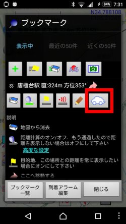 ※今回は,URLと電話番号が1件ずつだったので1つめの画面に意味がないように見えますが, 説明欄に2件以上のURL,電話番号が入っている場合は,1つめの画面でどれを使うかを選べます. ブックマークの場所をGoogleマップアプリに送る今までの説明では,Googleマップアプリから地図ロイドへのデータ共有でしたが, 逆方向もできます.(逆方向は,主にナビ利用を想定しています)地図上にマークを表示した状態で,MENU-ブックマーク または,距離などがでている上の青ボタンを押すと, ブックマーク画面がでます. ここで右端の車のボタンを押せば,Googleマップアプリに共有できます.