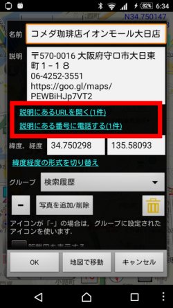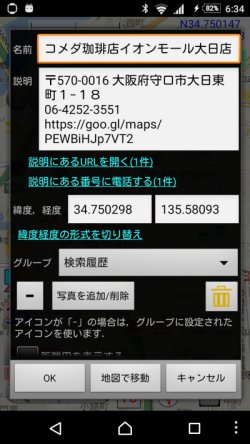 情報が出ますが,説明欄に住所や電話番号などの情報が入っており, また,ブックマークの検索履歴グループに登録されていることがわかります.