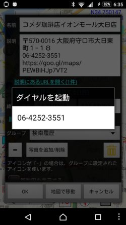 ブックマークから直接ブラウザ,電話を起動する地図ロイドは,ブックマークやトラックログの説明欄にURLや電話番号が入っている場合に, ブラウザ,電話アプリを起動することができます.この機能は例えば,山小屋をブックマーク登録したときに,連絡先電話番号を一緒に登録するなどの使い方を想定していますが, Googleマップアプリから作成したブックマークでも,当然それは使えます. 先ほどの画面で,