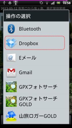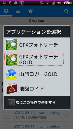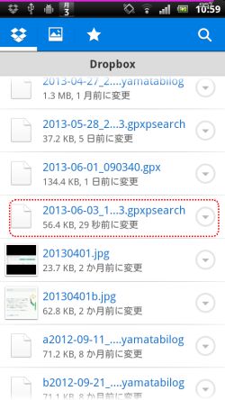 復元する方法GPXフォトサーチを終了した状態で,Dropboxアプリを起動します.そして,先ほど送信したファイルをタップします.