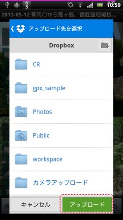 すると,データをどこにアップロードするかを選べます.今回は,Dropboxに置くことにします. ※Dropboxを使うには,事前にDropboxアプリをスマホにインストールして,使える状態にしておく必要があります. また,あとで説明しますが,Dropboxなどのクラウドサービスを使わない方法もあります.