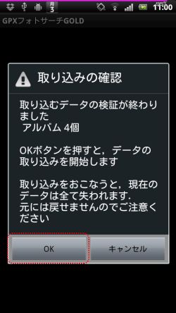 ここから先は,Dropboxの場合と同じです. 内容の確認を行ったあとの画面が出ますので,OKを押すとアルバムが復元されます. |