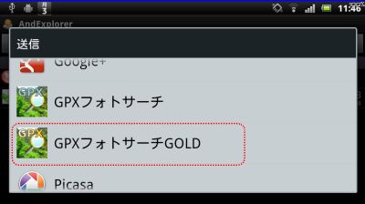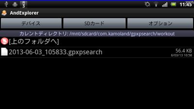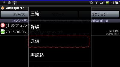このように,SD(機種によっては内蔵)の中の, com.kamoland/gpxpsearch/workout/というフォルダの中に, 2013-06-03_105833.gpxpsearchなどの名前で作られています(最初の数字は,作成したときの日付と時刻です). このファイルを,各自で別の場所にバックアップしておいて下さい. 復元する方法ですが,そのファイルをスマホから見える場所に置いた状態で,ファイルマネージャアプリを使います. 今回は, AndExplorer を使いますが, ESファイルエクスプローラー など他のアプリでも同じようにできると思います. バックアップしたファイルを選んで「送信」として下さい.