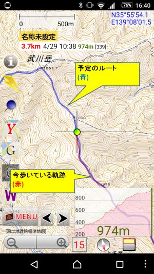この状態にしておけば,山旅ロガーでログを取りながら歩いているときに,山旅ロガーから地図ロイドを起動すれば,それまでの軌跡と予定のコースが重ね合わせて表示されます