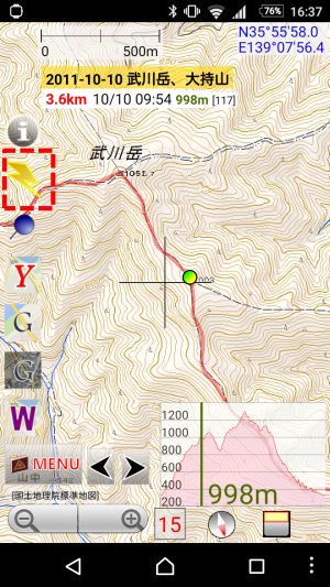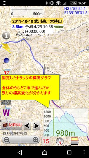 参考にするコースを画面に表示するだけなら,ここまでで完了です. なお,上の画面では,右下の標高グラフが今歩いている軌跡のグラフになっています. コース全体の中で今どこまで進んだかを知りたい場合は,情報を表示するトラックを, 予定コースのトラックに固定してください. グラフのマークが出ている固定ボタンを押してください.
