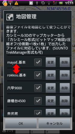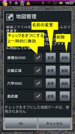 今回は説明のためにWindowsに標準で付いているペイントを使いましたが,ビットマップ形式で保存できるお絵かきツールでしたら何でも良いはずです. ここで保存したbmpファイルを,スマホにコピーして,地図ロイドに取り込むという手順になります. (B) 複数のマップを使いこなす1. マップ名の変更,マップの削除マップ名の変更,マップの削除は,地図の取り込みで使った画面でボタンを押して下さい.