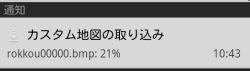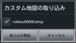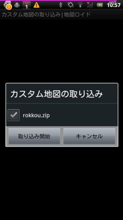 ファイルをどこにコピーすればよいかが表示されています.この機種の場合は /mnt/sdcard/chizroid/import になっています. これは機種によって違います.例えばNexus7(Android 4.2)では,/storage/emulated/0/chizroid/import です. また,「フォルダを変更」ボタンを押すと,好きなフォルダに変更できます. このフォルダに,USB接続などを使って先ほどの2個のファイルをコピーして下さい. ※なお,.hdr,.bmpの2つのファイルを使う代わりに,この2ファイルをzip形式に圧縮して, そのzipファイルをこのフォルダに入れる方法も使えます. また,このフォルダにコピーしなくても,Dropboxから直接取り込むこともできます. Dropboxからの取り込みは,後の「高度な使い方」で説明します. 3.地図ロイドにファイルを取り込む先ほどの地図ロイドの画面で,「取り込み開始」ボタンを押すと, 取り込みフォルダに入っているデータの一覧が表示されます.