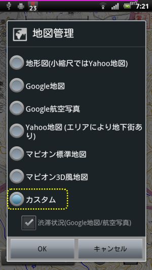 4.地図ロイドでカスタム地図を表示するメニュー-地図管理 の「モード」で,カスタムを選んでOKを押して下さい.