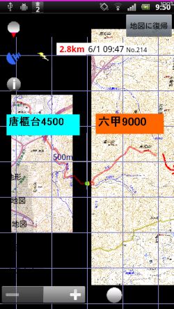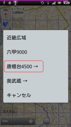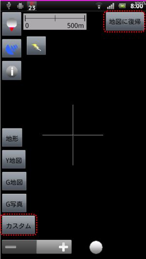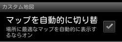 ※このように自動的に切り替わるためには,条件があります. 移動先のマップの縮尺が,現在表示している縮尺の約4倍を越えているか,約1/4より小さいと,場所がマッチしていても表示されません. その場合は手動で,移動先のマップを選択して下さい.左下の「カスタム」ボタンか,地図モードでカスタムを選び直してください. 今回の例では,電子国土の4500と9000ということで2倍に収まっているため,自動的に切り替わりました. また,何らかの理由で自動的に切り替わると不都合がある場合は,設定でオフにできます. メニュー-設定の「マップを自動的に切り替え」です.