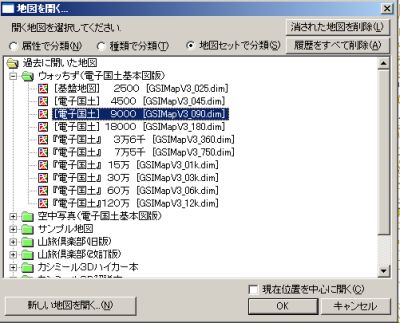 これは,表示する地図を事前にパソコンで準備しておいて,それを表示するというものです. 国土地理院の地形図そのままではなく,自分で色々な情報を書き込んだ地図を作っておいて,それを表示したいという場合に,この機能の意味があると思います. また,地図ロイドはもともとキャッシュ機能があるため,電波圏外であっても事前に読み込んでおいた地図の表示はできるのですが, カスタム地図を使うと自分の手元で地図データを完全に把握できる,という安心感もあるかも知れません. 1.地図データの作成カシミール3Dを起動して下さい. 今回は簡単な例として,電子国土9000を切り出してみます.(これだと地図ロイドで地形図を表示するのと同じでほとんど意味がないのですが,あくまで操作の説明です) ファイル-地図を開く
