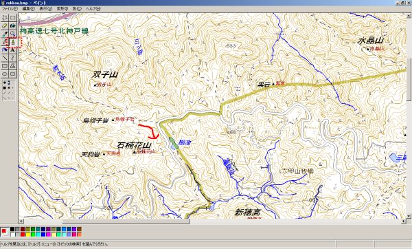 真ん中に手書きの赤い矢印がありますが,これはペイントツールで入れたものです.後で説明します. 地図の範囲外からの復帰地図をスクロールして範囲外に出てしまうと,画面が真っ黒でどうすればよいかわからなくなるかも知れません.その場合は,右上の「地図に復帰」ボタンを押して下さい.地図の中心位置にジャンプします.