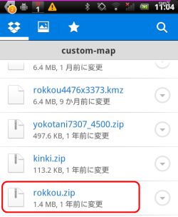 通常は,取り込む時のファイル名に拡張子を含めておけば(「rokkou.基本.bmp」など),自動的にそのままマップ名に残りますので楽だと思います. (C) Googleドライブ,Dropboxを使って取り込みを便利にする既に説明した地図の取り込み方法では,地図のファイルをUSB接続などを使ってパソコンからスマホにコピーしていました.これを,もう少し簡単にする方法があります.ただしスマホとパソコンで,DropboxまたはGoogleドライブアプリを使える状態になっている必要があります. まず,地図データをzipファイルにして下さい.先ほどの例だと,