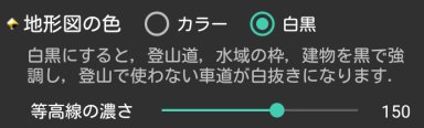 ※白黒にすると,登山道,水域の枠,建物を黒で強調し, 登山で使わない高速道路,国道,県道が白抜きになります. 白黒印刷向けの設定です. ■ 等高線の濃さ等高線の濃さを,調整できます.(標準は150です)