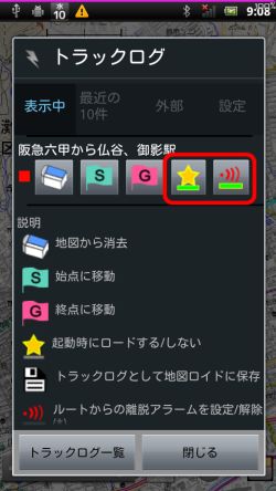 Android Wearスマートウォッチでの通知, Sony SmartWatchでの通知, Taskerイベントの発火 にも対応しています. ※なお,目的地に着いたときにアラームを鳴らしたい場合は,到着アラーム機能をご利用ください. → 場所に着いた時にアラームを鳴らす ルートを登録する最新の地図ロイド(v10.7以上)でそのルートを地図上に表示して,稲妻ボタンの画面から設定します.「起動時にロードする」をオンにして,「離脱アラーム」をオンにしてください.2本以上のルートに設定しても構いません.