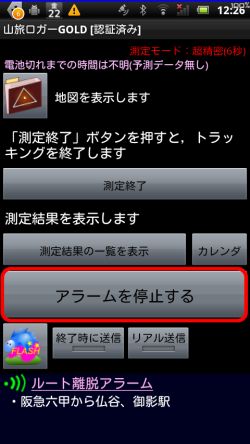 山旅ロガーから停止するには,山旅ロガーの画面の「アラームを停止する」ボタンを押して下さい.